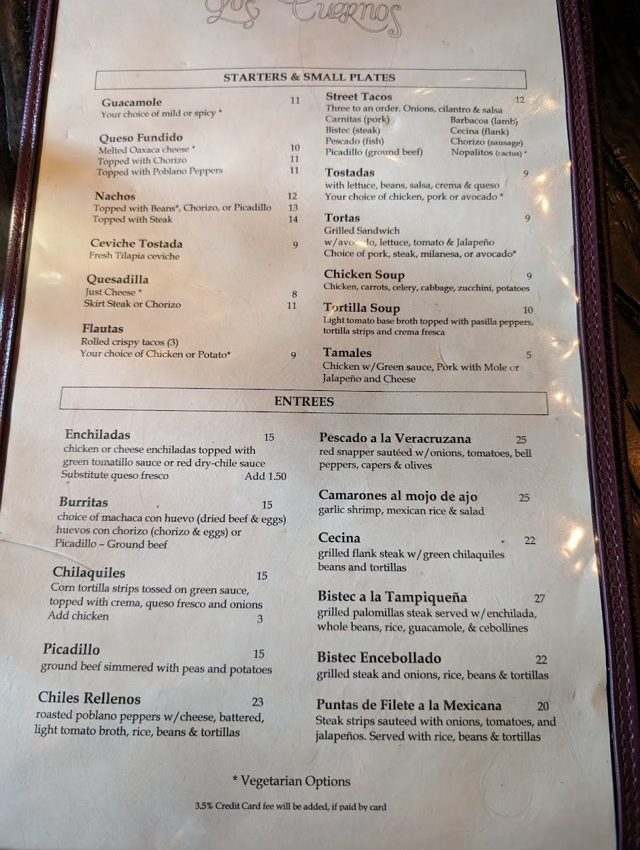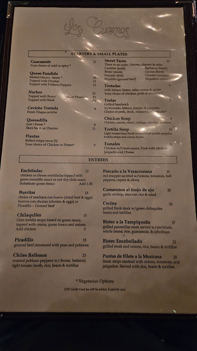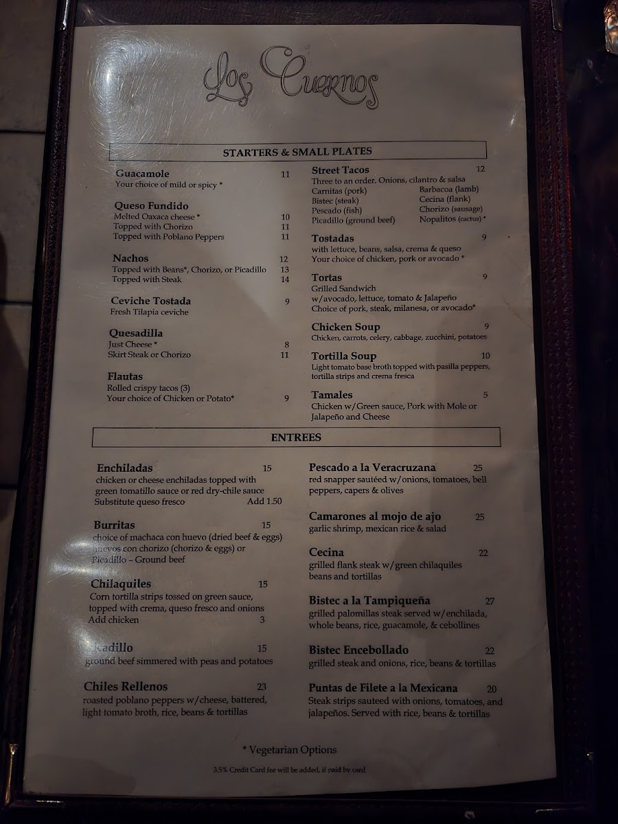 The menu at Los Cuernos boasts an impressive selection of mouthwatering dishes. Start your culinary journey with their Antojitos, such as the flavorful Flautas filled with succulent chicken or fluffy potato, each for just $9.00. You can't go wrong with the Tacos, which have received rave reviews for being absolutely delicious—a must-try staple! If you're feeling adventurous, the Ceviche Tostada, featuring fresh tilapia, is sure to impress. For something heartier, dive into the Tortas, grilled sandwiches generously layered with avocado, jalapeños, and your choice of protein.